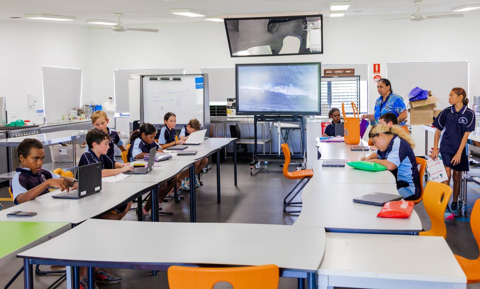 Our hospitality classroom is used for Middle School Home Economics subjects and Primary School cooking, complete with six work spaces, including ovens and commercial dishwasher, this facility greatly enhances the students ability to learn new skills. This space is also used in Art classes.